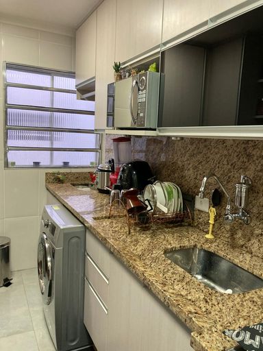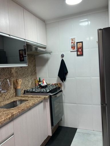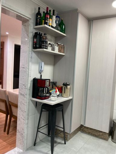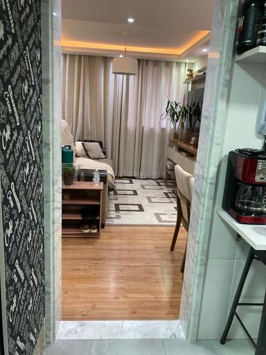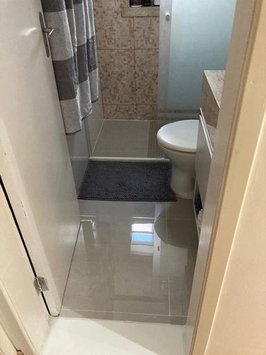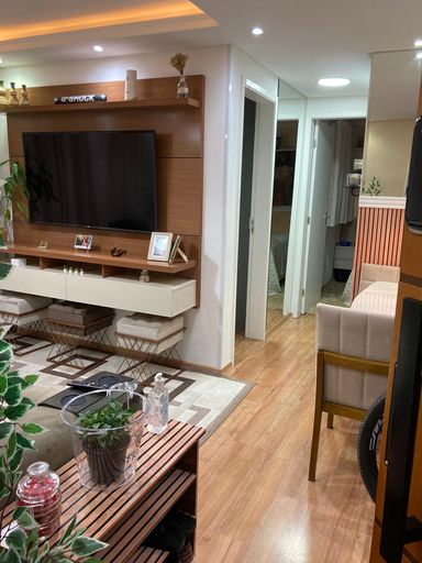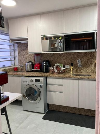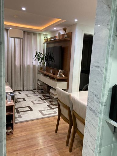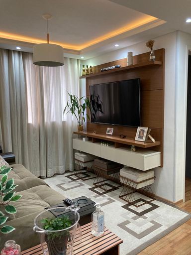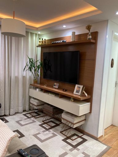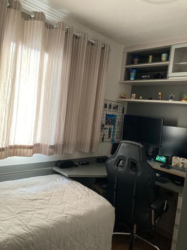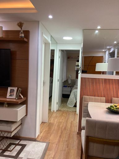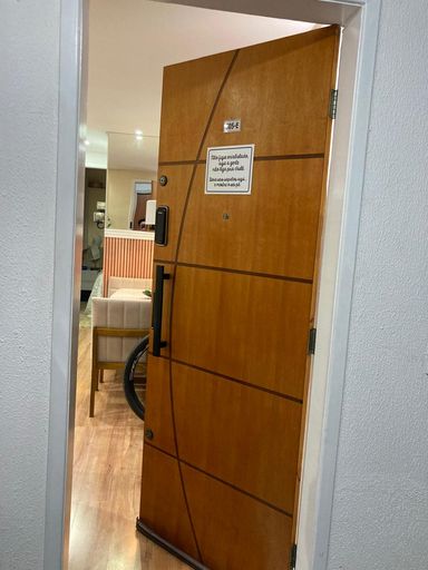 Piso laminado na sala e quartos e porcelanato na cozinha e banheiro.